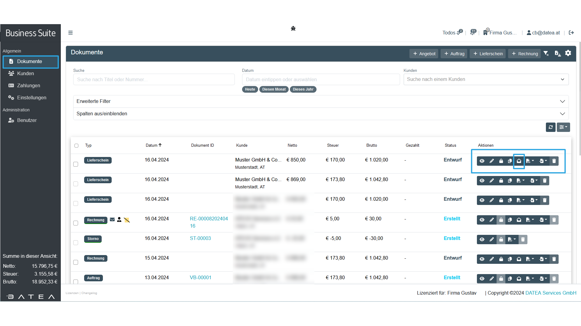Du kannst deine fertiggestellten Dokumente direkt per E-Mail versenden. Voraussetzung dafür ist, dass die Mail-Einstellungen korrekt hinterlegt sind und dein Dokument als PDF-Datei (Symbole) vorliegt.