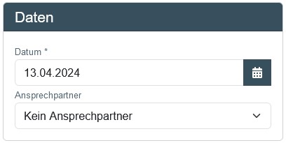Das Erstellungsdatum wird automatisch auf den aktuellen Tag gesetzt. Du kannst auch einen Ansprechpartner (Firmen-Ansprechpartner für den Kunden ) benennen. Die Ansprechpartner entsprechen den Benutzern, die im System hinterlegt sind und werden hier automatisch angezeigt.