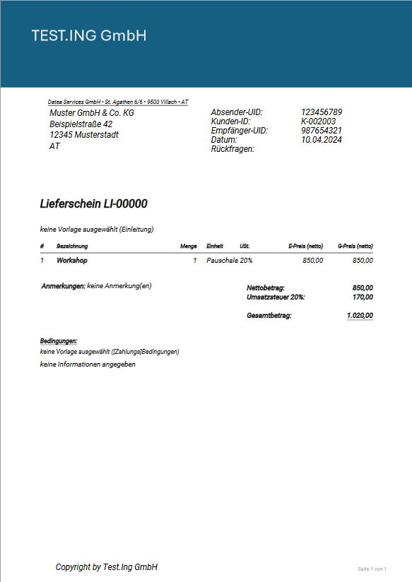 Erst nach dem Abschließen bzw. Festschreiben werden deine Lieferscheinnummer und alle Platzhalter „aktiviert“ und eingefügt. Nachdem du den Lieferschein festgeschrieben hast, ist ein Löschen nicht mehr möglich. Unser Beispiel-Lieferschein sieht festgeschrieben so aus (Anmerkung: es ist ein Beispiel-Layout hinterlegt):