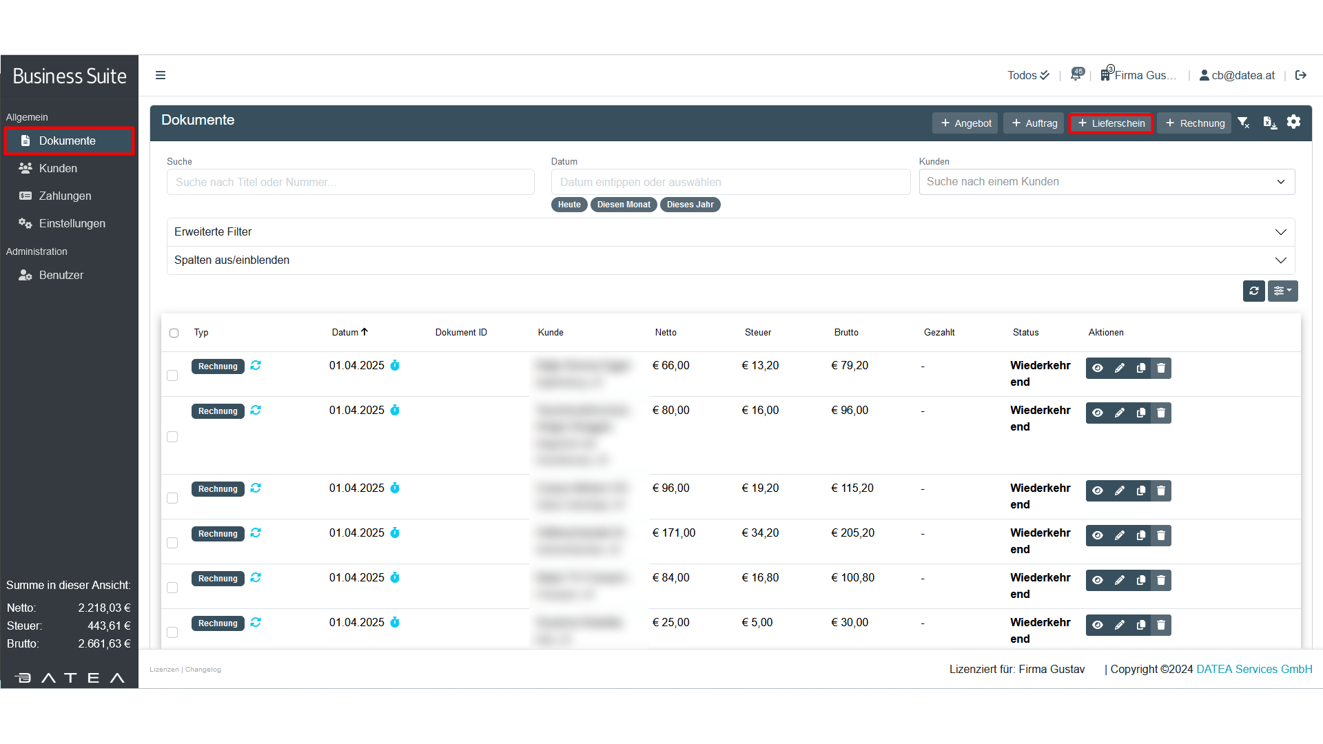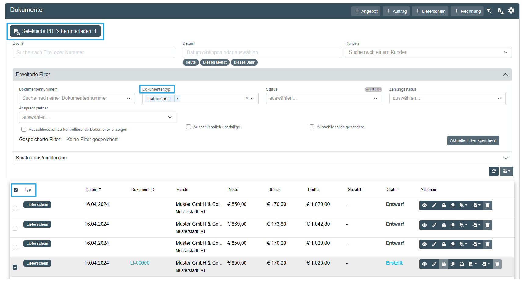 Sobald du deine Dokumente als PDF generiert hast (Symbol: PDF-Aktionen) , kannst du sie – einzeln, nach Dokumententyp, Datum oder einem anderen gewünschten Filter – mit nur einem Klick herunterladen. In diesem Beispiel sollten alle erstellten (festgeschriebenen) Lieferscheine heruntergeladen werden. Der entsprechende Filter (Dokumententyp: Lieferschein) wurde angewendet (blaue Markierung).