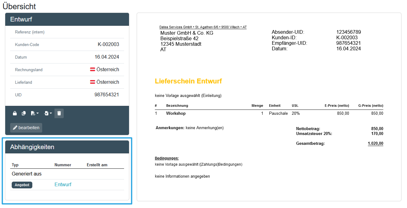 In der Übersicht wird dir auch angezeigt, aus welchem Dokument dein Lieferschein generiert wurde.