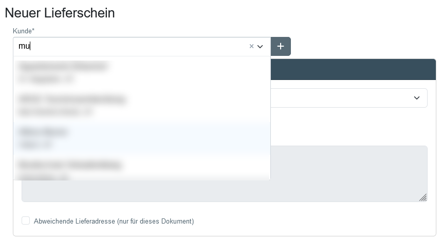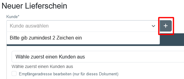 Wähle einen Kunden aus, indem du die ersten beiden Zeichen eingibst und den entsprechenden Kunden auswählst. Die Empfängeradresse wird automatisch unter „Empfängeradresse“ eingefügt. Bei Bedarf kannst du für dieses Dokument die Empfängeradresse bearbeiten oder eine abweichende Lieferadresse angeben.