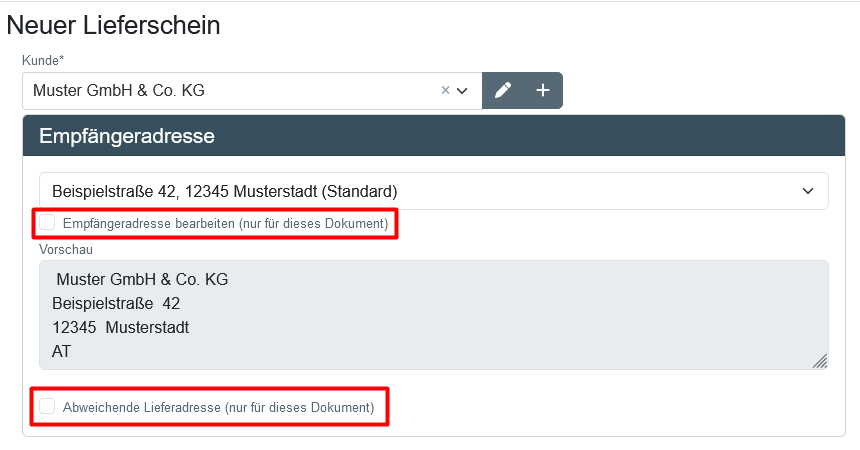 Die Empfängeradresse wurde bereits automatisch, aufgrund des ausgewählten Kunden und dessen hinterlegten Daten, ausgewählt. Du kannst jedoch sowohl Rechnungsadresse als auch eine (abweichende) Lieferadresse für das aktuelle Dokument bearbeiten. Setze dazu einfach das entsprechende Häkchen. Diese Änderungen werden nur für das aktuelle Dokument übernommen. Möchtest du dauerhafte Änderungen speichern, geht das in der Kundenverwaltung.