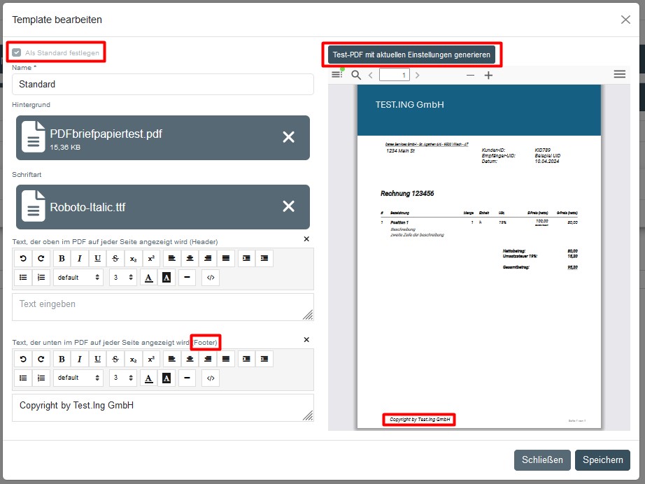 - Hintergrundbilder können sowohl als PDF als auch als Bild, Schriftarten ausschließlich als ttf. Datei hochgeladen werden
