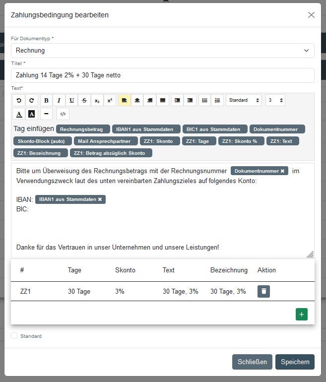 Sobald du deine Zahlungsziele festgelegt hast, erscheinen sie als dynamische Platzhalter, zum Beispiel ZZ1, ZZ2 usw., abhängig von der Anzahl deiner definierten Ziele. Du kannst diese Platzhalter einfügen, indem du nach Positionierung des Cursors an der gewünschten Stelle auf den jeweiligen Platzhalter anklickst. Dieser erscheint dann im Textbereich. In deinem festgeschriebenen Dokument werden alle Platzhalter automatisch durch die festgelegten Zahlungsbedingungen ersetzt, sodass das Dokument die korrekten Zahlungsziele anzeigt.
