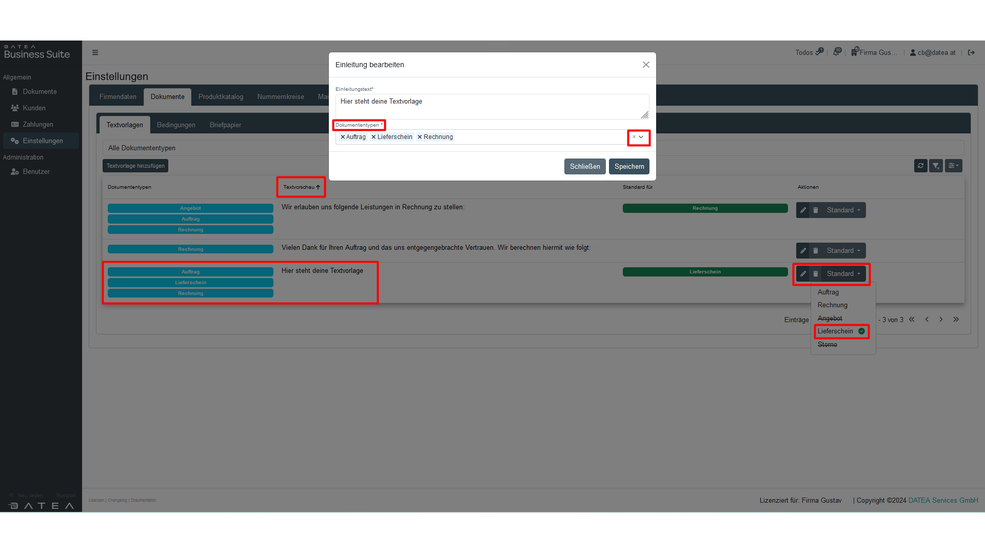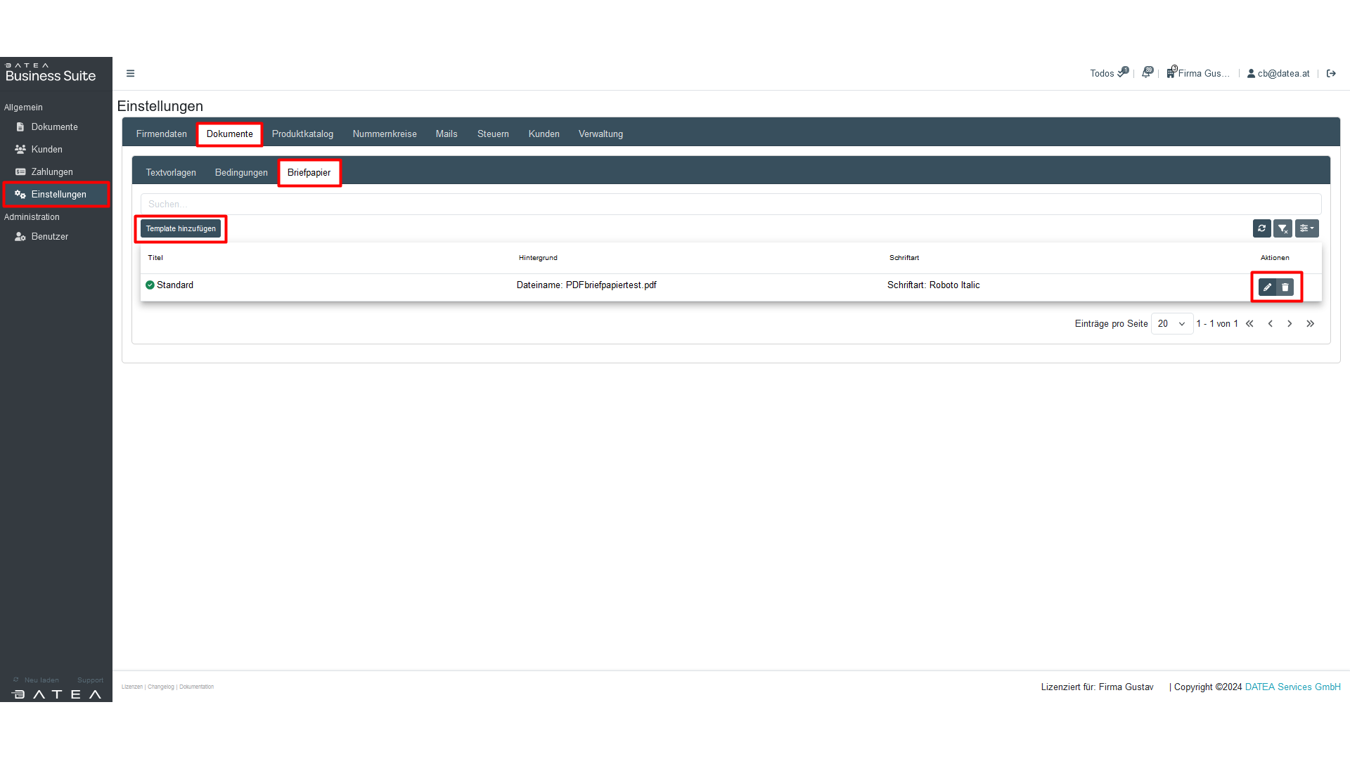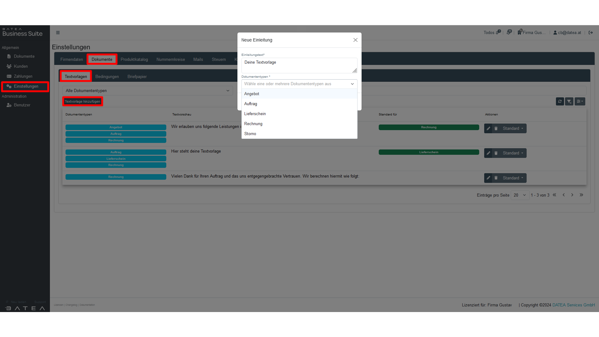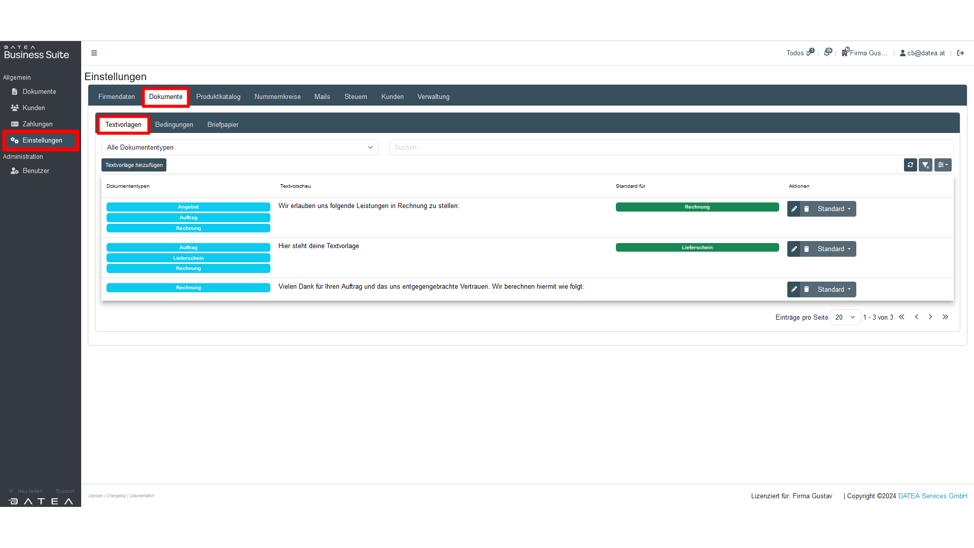 Dokumente umfassen Angebote, Aufträge, Lieferscheine und Rechnungen . In diesen Einstellungen kannst du individuelle Textvorlagen erstellen und anpassen, grundlegende Informationen wie (Zahlungs)Bedingungen hinterlegen sowie dein eigenes Briefpapier hochladen, um sicherzustellen, dass alle Dokumente den Anforderungen deines Unternehmens entsprechen.