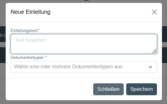 Hier kannst du Textvorlagen für den jeweiligen Dokumententyp erstellen. Klicke auf „Textvorlage hinzufügen“ . Es öffnet sich ein neues Fenster (Bild rechts). Gibt den Einleitungstext ein, wie z.B. „Ich erlaube mir folgende Leistung in Rechnung zu stellen“ und wähle den Dokumententyp (Angebot, Auftrag, Lieferschein, Rechnung, Storno) aus, für den dieser Text verfügbar soll.
