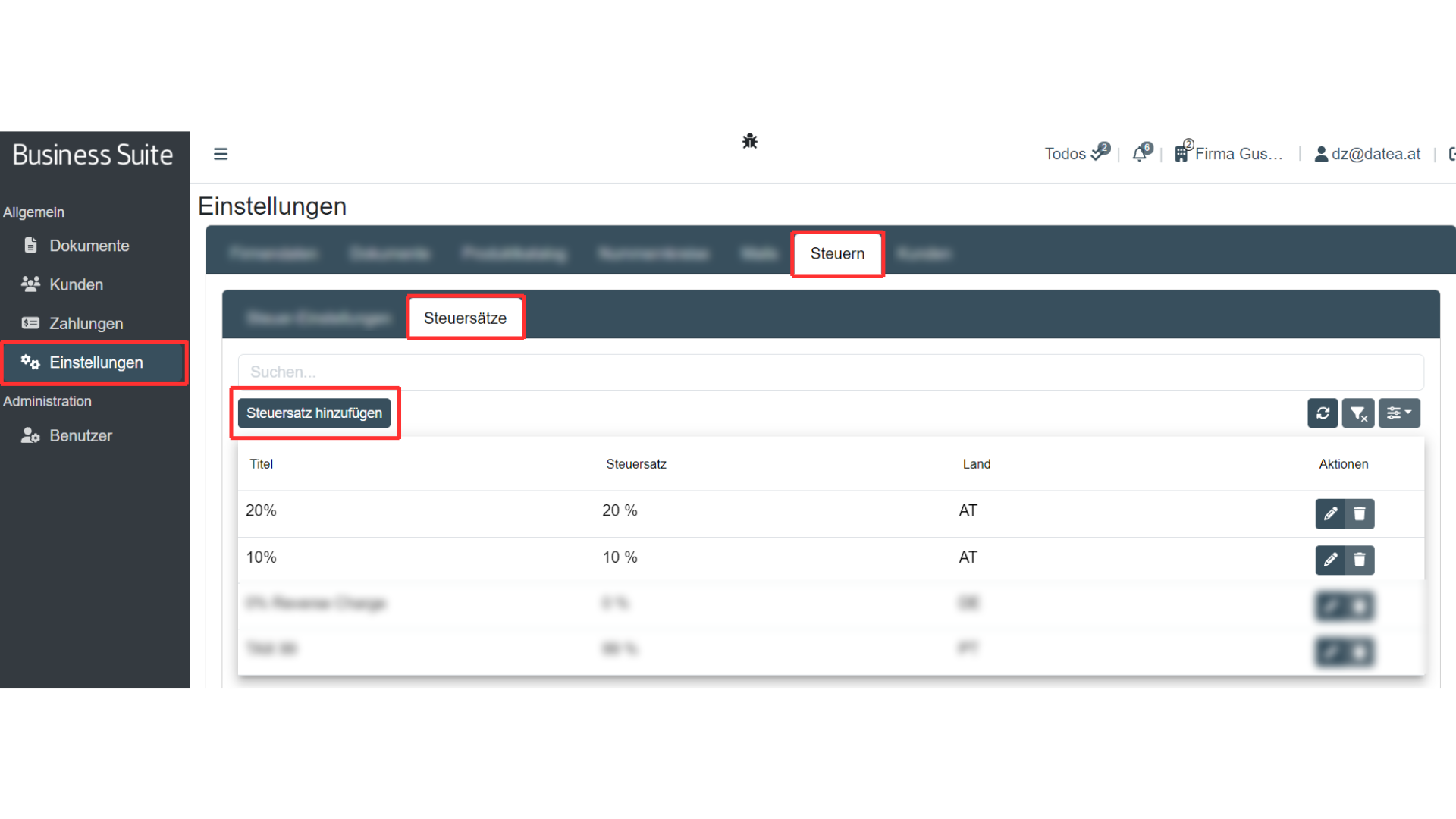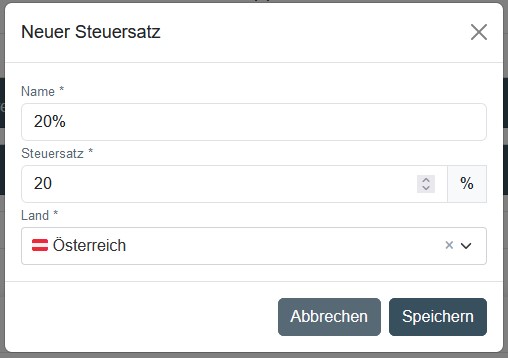 - Nun kannst du Name, Steuersatz und Land eingeben