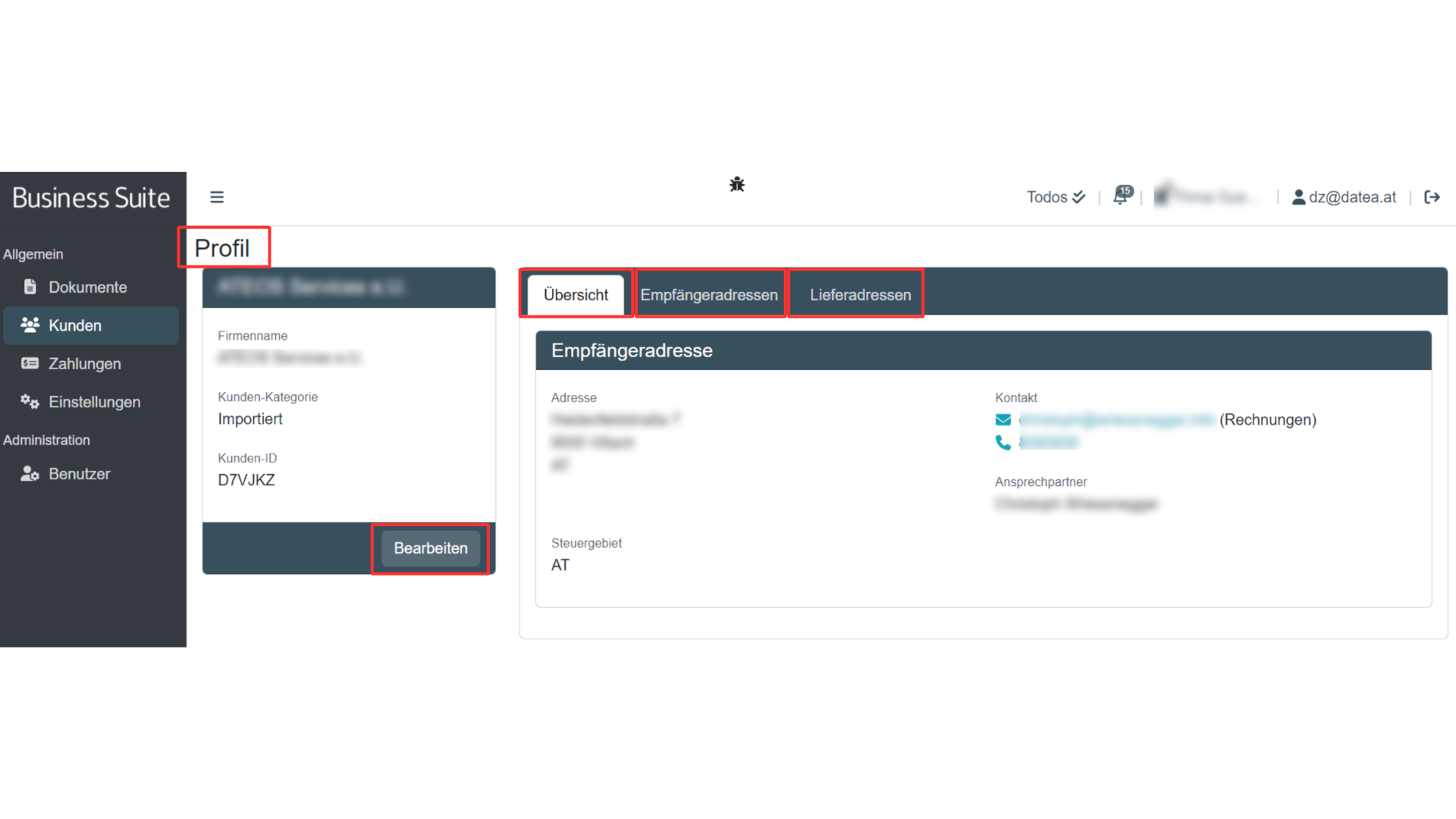 Hier findest du allgemeine Informationen, Informationen zur Rechnungsadresse, sowie Lieferadresse. Klickst du auf Bearbeiten, kannst du die Kundendaten bearbeiten.
