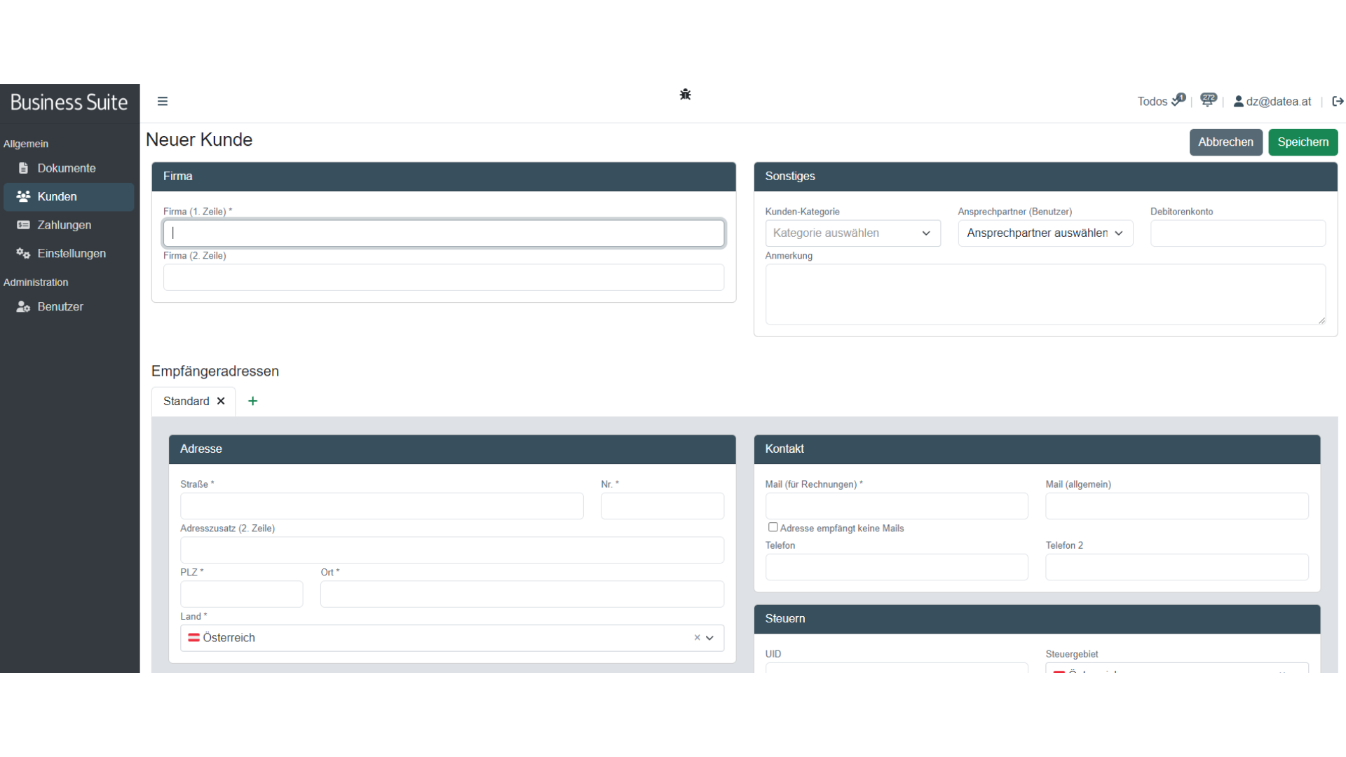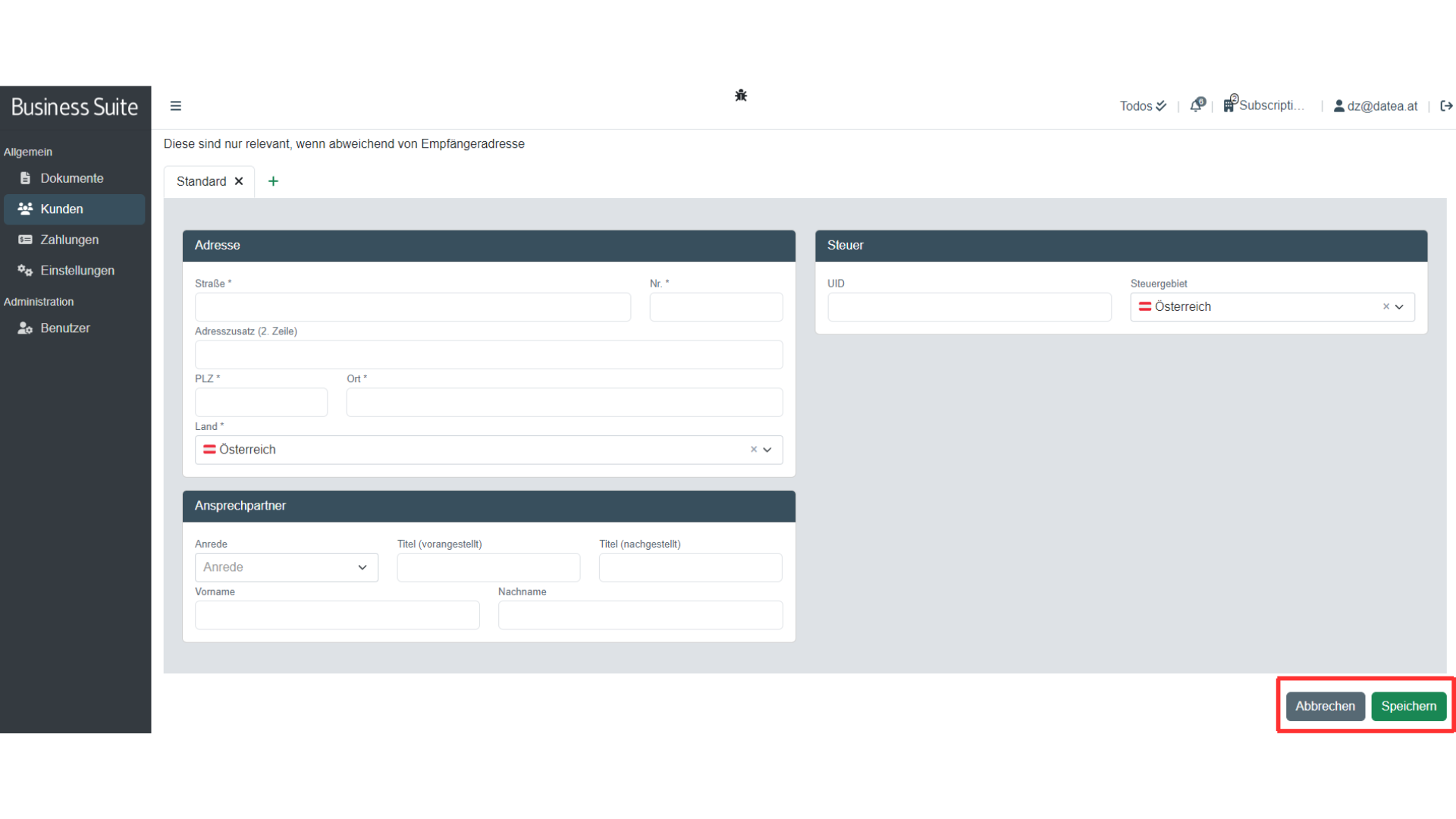 Um den erstellten Kunden abzuspeichern klicke auf das grüne Symbol Speichern. Dieses findest du rechts am Seitenanfang sowie rechts am Seitenende