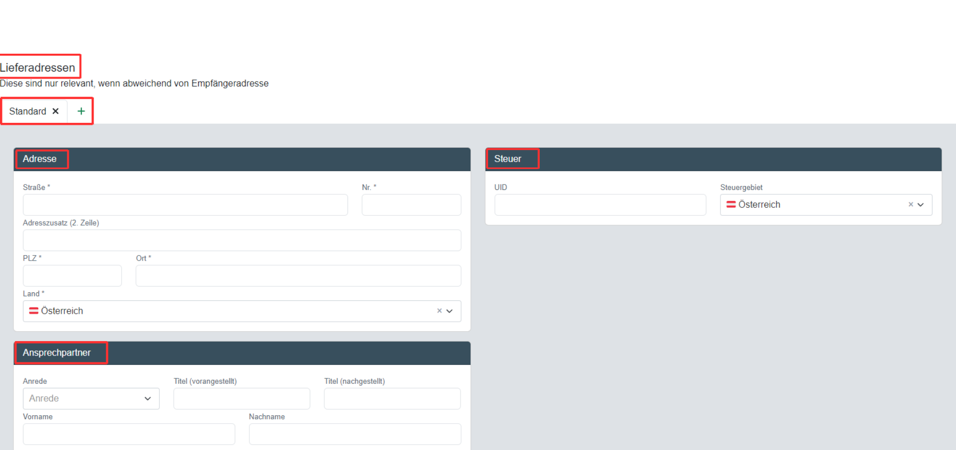 Gibt es eine von der Empfängeradresse abweichende Lieferadresse, so kann diese hier festgehalten werden. Klicke dazu auf das gründe + Symbol. Es öffnen sich die Kategorien Adresse, Ansprechpartner und Steuer. Der Ansprechpartner ist eine Person im Unternehmen des Kunden, welcher für dich zuständig ist.